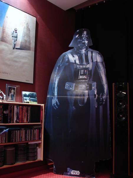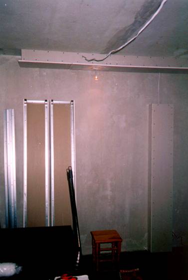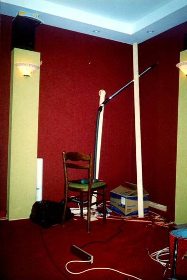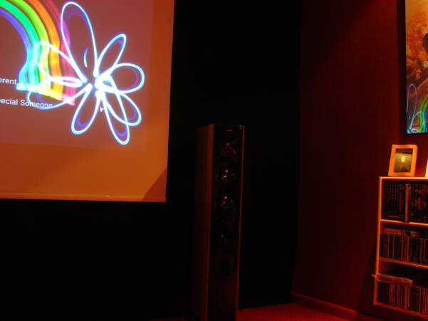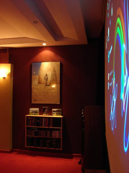 Projekt zakładał wykorzystanie zwyczajnych materiałów w celu poprawy akustyki, i np. na całej powierzchni podłogi została położona wysokiej jakości dwuwarstwowa wykładzina dywanowa. Myślałem także nad poprawieniem akustyki pomieszczenia poprzez wytłumienie ścian bocznych blisko głośników frontowych. Kiedyś podczas wizyt na wystawach Audio Show organizowanych w najlepszych warszawskich hotelach, widziałem jak wystawcy sprzętu hi-end chcąc poprawić akustykę pokoi hotelowych, okładali boczne ściany materacami zdjętymi z hotelowych łóżek. Może i to śmiesznie wygląda, ale efekt daje dobry. Ja jednak nie wyobrażam sobie mieszkać w pokoju z przytwierdzonymi materacami do ścian. Szukałem rozwiązania praktycznego. Pomyślałem, że dobrym rozwiązaniem byłoby umieszczenie w dolnej strefie bocznych ścian półek na archiwum płyt z filmami i muzyką. Zapewne pochłanianie dźwięku nie będzie tak dobre jak w przypadku specjalnego materiału (czyli zazwyczaj odpowiedniej grubości gąbka), ale przynajmniej będzie to całkiem niezły dyfuzor fal dźwiękowych.