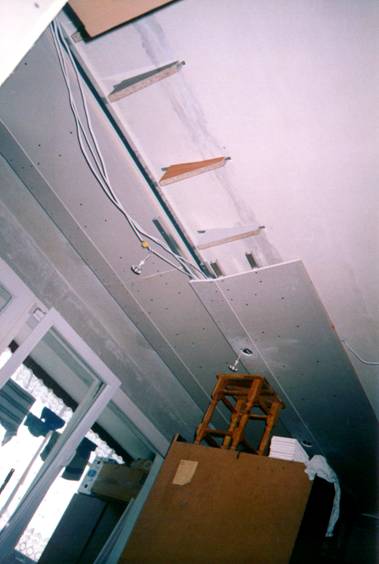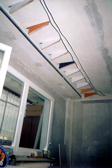 Tak czy inaczej, przezwyciężyłem myśli hamujące mnie przed dalszym działaniem. W głowie miałem teraz stworzenie magicznego miejsca, w którym będę się dobrze czuć. Sporo czasu zajęło mi zaprojektowanie sufitu, ponieważ chciałem aby pełnił on także funkcję poprawiającą akustykę pomieszczenia. Generalnie chodziło mi o to, aby zredukować pierwsze odbicia fal dźwięku od sufitu. Tak naprawdę kształt sufitu jaki zaprojektowałem nie redukuje tych odbić, ale raczej zmienia kąty odbicia. W rezultacie do słuchacza dociera dużo mniej fal odbitych od sufitu. Redukcja pierwszych odbić fal od sufitu i podłogi jest jednym z warunków certyfikacji kina THX. Oczywiście nie miałem zamiaru spełniać wszystkich warunków akustycznych THX. To przecież projekt budżetowy.