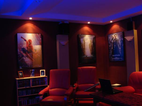 W sumie mamy tu 3 strefy oświetlenia. Każda strefa kontrolowana jest programowalnym pilotem na podczerwień (wszystkie strefy z funkcją płynnego ściemniania). Podsumowując, przy maksymalnym wysterowaniu, wszystkie żarówki pobierają prawie 600 watów mocy. To całkiem sporo jak na pokój o wymiarach 4m x 4.6m x 2.5m. Mimo to, w pomieszczeniu nie jest zbyt jasno. To zasługa ciemnej kolorystyki ścian. Generalnie pokój jest ciemny, ale dzięki temu łatwiej wytworzyć kinowy klimat. Dzięki temu mamy też lepszy odbiór obrazu z projektora. Dlaczego? Ekran jest duży. Jego wymiary to 243cm x140cm, czyli przekątna to 111 cali. W związku z tym, przy jasnych scenach, od ekranu jest odbijana duża ilość promieniowania świetlnego, które z kolei mogłoby rozświetlić niepotrzebnie cały pokój. Dzięki ciemnej kolorystyce pomieszczenia, rozświetlenie pokoju światłem odbitym jest zminimalizowane – otrzymujemy lepszy kontrast i lepsze kolory na ekranie. Także profil sufitu sprawia, że światło odbite od ekranu nie wraca z powrotem na ekran, ani nie jest kierowane bezpośrednio w widza. To był także jeden z ważniejszych warunków projektu.