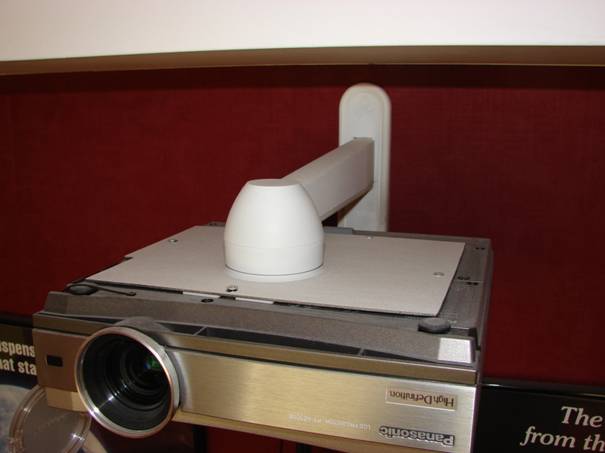 Podczas realizacji projektu miałem okazję zaoszczędzić troszkę pieniędzy obmyślając własne mocowanie projektora pod sufitem. Do projektora oczywiście można wykorzystać dedykowane mocowanie – czyli na pierwszy rzut oka kawałek odpowiednio powyginanej blachy z dziurami na śruby mocujące – koszt około 700zł. Gdybym miał coś takiego wykorzystać, musiałbym dokonać dodatkowo kilku modyfikacji, ponieważ fabrycznie produkt przystosowany jest do mocowania bezpośrednio do sufitu. Ja zaplanowałem zamontować projektor jak najbliżej tylniej ściany wysoko przy suficie, tak aby uzyskać możliwie jak największą przekątną obrazu, niestosując żadnych funkcji modyfikacji kształtu obrazu w projektorze. Jednak konstrukcja sufitu uniemożliwiała mi to. Jedyna możliwość to wykonanie własnoręczne odpowiedniego mocowania na projektor. Dobrym rozwiązaniem okazało się specjalne ramię przytwierdzane do ściany. Znalazłem coś takiego w Castoramie za niewielką sumę (ok. 70zł).