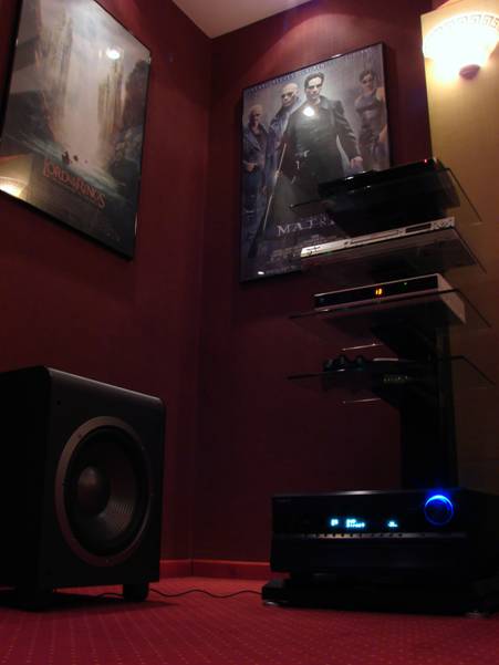 Zapewne wielu z czytelników dziwi się, dlaczego opowiadając o swoim kinie domowym, praktycznie pominąłem temat sprzętu. Gdzie na zdjęciach są wzmacniacze? Wg mnie, najlepiej aby sprzęt nie był widoczny dla użytkownika. Sprzęt to tylko kolejne „narzędzie”, które powinno wykonywać swoją pracę w cieniu, nie przykuwając uwagi użytkownika, ani nie rozpraszając go świecącymi kontrolkami. Widok pięciu pilotów zdalnego sterowania na stole? To koszmar! W moim projekcie przyjąłem zasadę, że to nie sprzęt jest najważniejszy, ale właśnie klimat i akustyka. Dyskusja nad jakością sprzętu jest pozbawiona sensu, jeśli pomijamy kwestię akustyki pomieszczenia. To dlatego pod ekranem nie ma wzmacniaczy. Stoją z tyłu, z boku. Niestety, w praktyce, w relatywnie niewielkim pomieszczeniu nie miałem możliwości wkomponowania szafy typu RACK, która byłaby kompletnie niewidoczna. Zamiast tego poszedłem po raz kolejny na kompromis: Wzmacniacze i urządzenia źródłowe stoją na eleganckim regale MULITMEBEL ROCK A205. Niestety nie znalazłem na polskim rynku niczego bardziej eleganckiego i praktycznego. Wzmacniacz Onkyo TX-SR805 i tak ledwo się zmieścił. Ciężar wzmacniacza to kolejne ograniczenie dla regału, który na każdej półce może udźwignąć maksymalnie 15Kg (dane wg producenta). Ponieważ wzmacniacz waży ok. 25Kg, musi stać na dolnej podstawie.